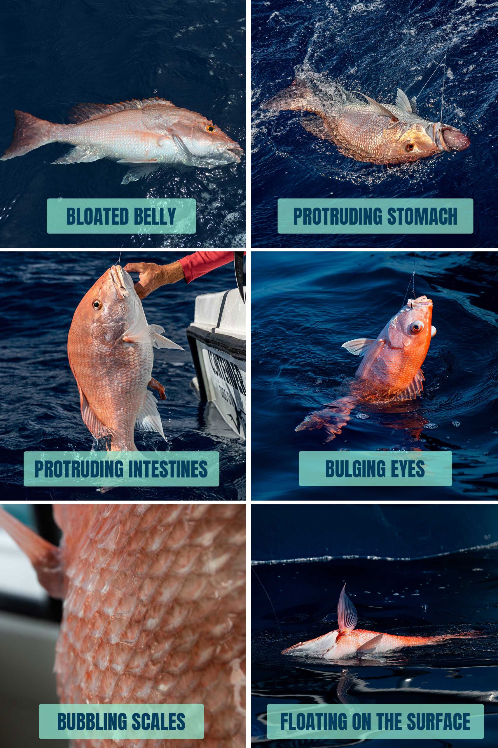 Barotrauma occurs when a fish experiences a sudden drop in pressure as it’s brought up from deeper water to the surface. Most reef fish, such as snapper and grouper, have a gas-filled organ called a swim bladder that helps control buoyancy. When pressure decreases quickly during ascent, the gas inside expands leaving them bloated and unable to return to depth. It’s important to note that the swim bladder isn’t the only organ or gases responsible for barotrauma, as is evidenced by eyes bulging in fish.